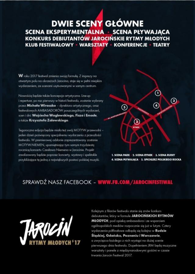 Ogłoszono pierwszych wykonawców rockowego festiwalu Jarocin 2017. Po raz pierwszy wyłoniono też kuratorów artystycznych festiwalowych scen, które będą rozlokowane w różnych miejscach w centrum miasta.