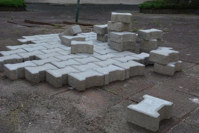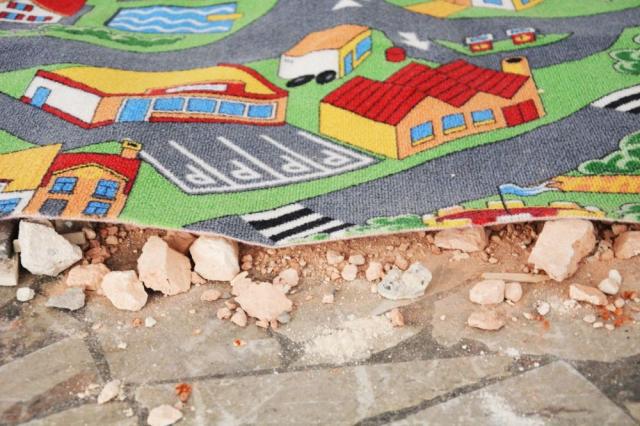 Maciej Cholewa, "Wykładzina". Instalacja składająca się z charakterystycznej dla pokoju dziecięcego wykładziny i gruzu ułożonego pod spodem. Przemieszczanie się po obrazku idealnie wyglądającego miasta jest problematyczne i powoduje dyskomfort u widza.