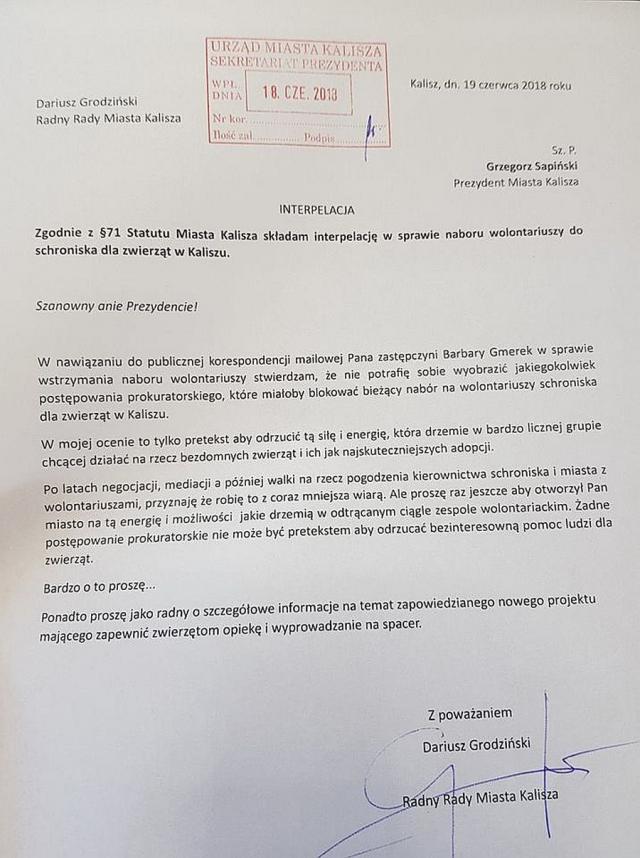 W sprawie zawieszenia wolontariatu radny miejski Dariusz Grodziński złożył dziś kolejną interpelację do prezydenta Kalisza.