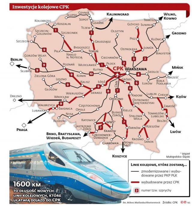 W ramach projektu powstanie sieć nowych linii kolejowych tzw. "szprych" z 10 kierunków Polski do CPK. Na jednej z nich znajduje się Kalisz. Centralny Port Komunikacyjny ma być organizmem opartym na połączeniach lotniczych, kolejowych i drogowych. To aktualnie najważniejsza inwestycja infrastrukturalna w Polsce, która obejmuje 100 największych miast w Polsce, w tym to najstarsze. W praktyce, dzięki modernizacji sieci kolejowej z Kalisza do Poznania dostaniemy się w ciągu 30 minut, a do Warszawy w ciągu ok. 2 godzin. Łącznie na budowę centrum rząd planuje wydać około 35 000 000 000 złotych. 8 000 000 000 złotych będzie kosztowała budowa samych połączeń kolejowych. Inwestycja rozpocznie się 2021 roku. Pierwszy samolot prawdopodobnie odleci z CPK w 2027 roku. Natomiast realizacja całego projektu, która obejmuje łącznie budowę 1600 km linii kolejowych ma potrwać do 2040 roku.