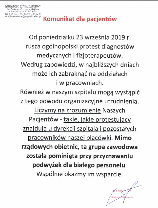 Jak będzie wyglądał protest? Trwają jeszcze ostatnie ustalenia, ale jak poinformowali szykujący się do strajku diagności i fizjoterapeuci z kaliskiego szpitala, możliwe są liczne nieobecności w pracy. To oznacza spore utrudnienia i ograniczenia dla pacjentów korzystających choćby z rehabilitacji czy zdjęć rentgenowskich.