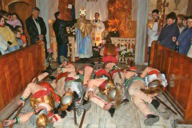 "Gdy ksiądz bierze monstrancję i zaśpiewa: "Wesoły nam dziś dzień nastał", wtedy żołnierze omdlewają i wszyscy sie przewracamy. Jeden na prawo, drugi na lewo. Po przejściu ksiądza z monstrancją budzę żołnierzy, aby powstali i zarzucając halabardy bierzemy udział w procesji. Po mszy jest taka tradycja, odprowadzania księdza pod halabardami na śniadanie."