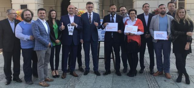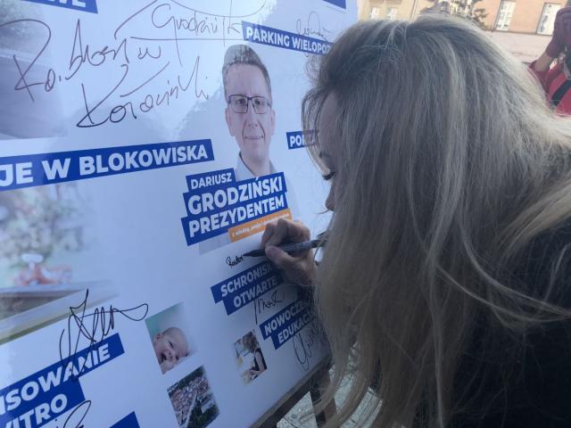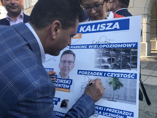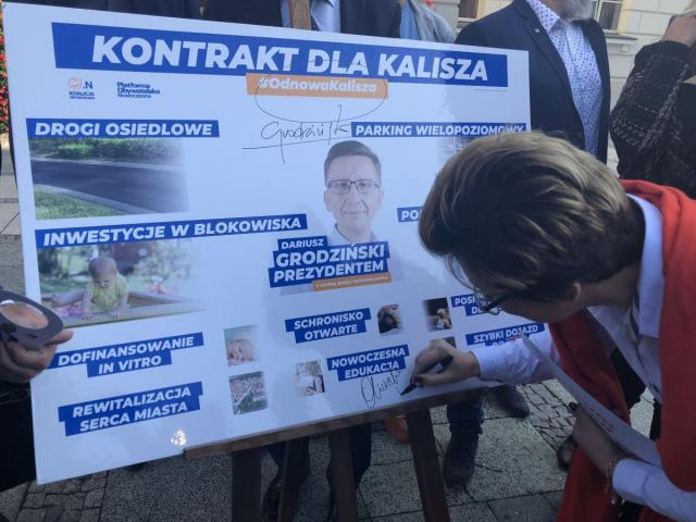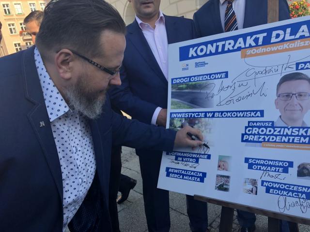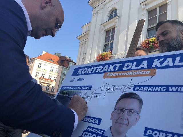 Dariusz Grodziński, kandydat na prezydenta Kalisza wspólnie z działaczami Koalicji Obywatelskiej podpisali w piątek przed kaliskim ratuszem zobowiązanie spełnienia wszystkich projektów, które przedstawili w ciągu ostatnich kilku tygodni: