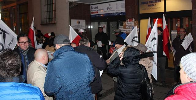 "Nie chcemy PiSorusi - Jarosław odejść musi!" "Lew na smyczy się nie liczy - nawet jeśli głośno ryczy!" (to pod adresem prezydenta Andrzeja Dudy). Takie skandowanie słychać było w samym centrum Kalisza w trakcje demonstracji ulicznej przed kaliskimi biurami posłów PiS przy ul. Zamkowej. Spontaniczny protest, który był podobnie jak w całym kraju, odpowiedzią na piątkowe wydarzenia w Sejmie i próbę ograniczenia wolności mediów, zgromadził kilkaset osób. Na demonstracji pojawił się jedyny odważny z 5 wybranych w naszym okręgu posłów PiS - Piotr Kaleta - który jak tłumaczył, "czuje się gospodarzem tego miejsca". Kaleta próbował przekonywać, że polska demokracja ma się dobrze i zmiany forsowane przez PiS prowadzą kraj w dobrym kierunku.