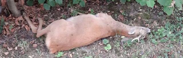 Padła lub zabita sarna leży przy drodze w Biskupicach Ołobocznych (w powiecie ostrowskim). Być może chora. Sarnie szczątki szarpią włóczące się, bezpańskie psy. Temperatura robi swoje.