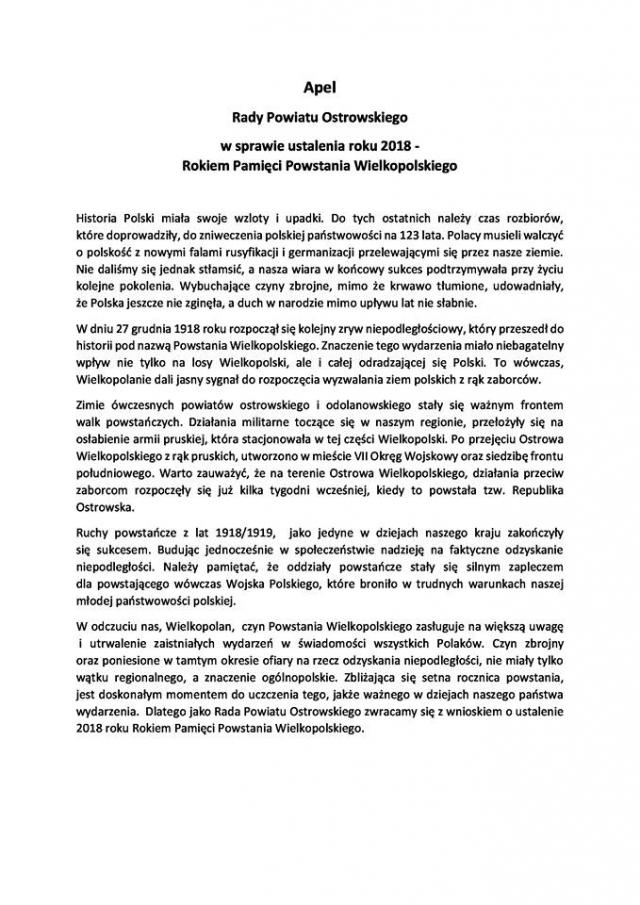 Czy 2018 rok będzie rokiem pamięci Powstania Wielkopolskiego? Z taką inicjatywą wyszła rada powiatu ostrowskiego, która przekazała stosowny apel do marszałka sejmu. A radni liczą, że w tych staraniach poprą ich parlamentarzyści.