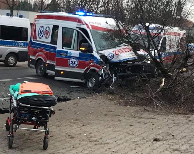 Policja ustala okoliczności i przyczyny wypadku - wstępne ustalenia wskazują, że kierowca osobowego auta wykonywał manewr skrętu w lewo - w tym momencie zderzył się z ambulansem na sygnale.