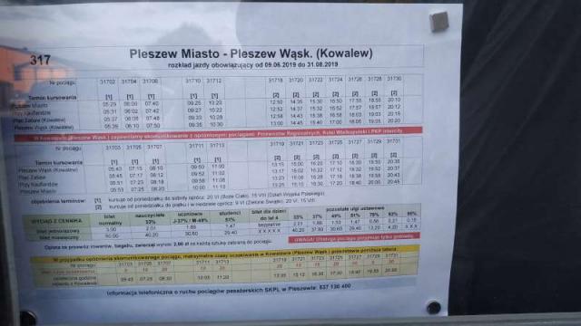 Rozkład jazdy kolejki znajduje się na tablicy informacyjnej biblioteki. Plac przed biblioteką jest peronem. Bilety kupuje się w wagoniku. Od najbliższej niedzieli przez cały sierpień kursować będzie z Pleszewa do Kowalewa kolorowy wąskotorowy wagonik (12:50, 14:35, 15:30, 16:50). Za nim pojedzie wagon zamknięty. Zgodnie z rozkładem kolejka będzie wracać. Czas pomiędzy dojazdem i powrotem można poświęcić na rozejrzenie się po stacji, gdzie pozostało wiele ciekawych kolejowych akcesoriów, czy nawet przyjrzenie się trzem torom, jedynym takim w Polsce.