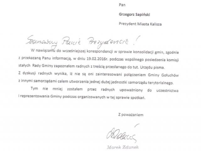 Kolejna gmina odrzuca pomysł prezydenta Kalisza Grzegorza Sapińskiego o przyłaczeniu jej do Kalisza.