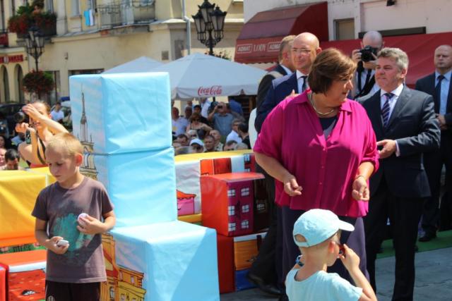 Potem para prezydencka spotkała się z najmłodszymi kaliszanami i ich rodzicami. Razem z dziećmi prezydent i jego małżonka zbudowali ratusz z ogromnych klocków.