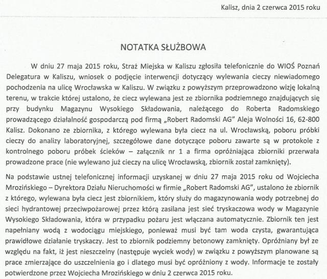 Jakiś czas temu, przy okazji opisywania dużego problemu ekologicznego dla Kalisza - w związku z magazynowaniem odpadów chemicznych przy ulicy Wrocławskiej na terenie prywatnych obiektów firmy Robert Radomski AG - wspominaliśmy o wypompowywaniu nieznanej cieczy w okolicy tychże magazynów oraz interwencji Straży Miejskiej, celem wyjaśnienia tych działań.