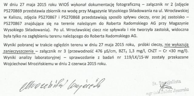 Przedstawił dokument Wojewódzkiego Inspektoratu Ochrony Śrdowiska, z którego wynika jednoznacznie, że cieczą tą była woda, magazynowana do celów przeciwpożarowych: