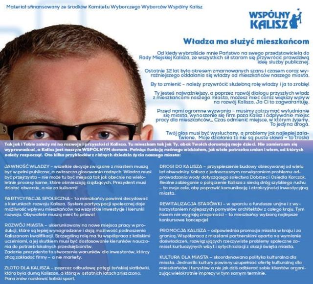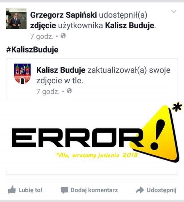 Profil ten, podobnie jak zależne od niego konto "Kalisz Buduje", prowadzone było prawdopodobnie dotychczas przez Wspólny Kalisz, zawiadywany przez usuniętego ostatnio zastępcę Sapińskiego - Piotra Kościelnego. Tam właśnie opublikowany został obrazek z wielkim napisem BŁĄD (error) i dopiskiem z datą następnych wyborów samorządowych - zamiast pochwalnych relacji z postępów miejskich inwestycji (za których brak pozbyto się z ratusza Kościelnego):