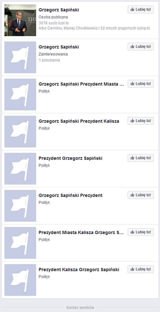 CIEKAWOSTKA: gdyby chcieć poszukać na Facebooku frazy "Grzegorz Sapiński - prezydent Kalisza", to doliczymy się jeszcze dodatkowych... 6 prezydenckich profili.