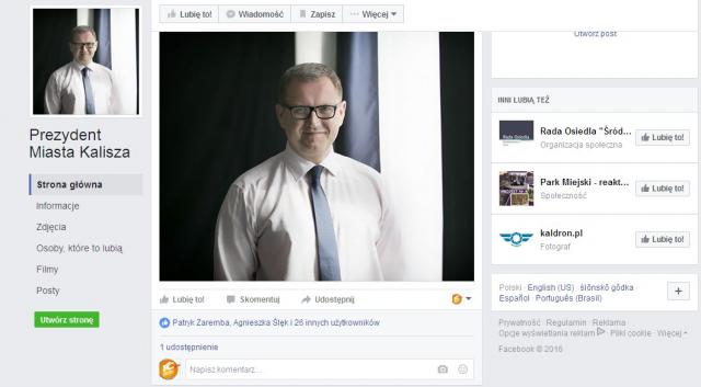 Potwierdzeniem podejrzeń, że obecny prezydent Kalisza, utracił kontrolę nad swoimi "internetowymi wizerunkami" może być fakt, że 7 września powstał nowy profil - "Prezydent Miasta Kalisza". Tam w smudze cienia (odchodzi? wyłania się?) stoi Grzegorz Sapiński. Rozwiązanie o tyle uniwersalne, że po zmianie prezydenta zostaje konto. NO I LAJKI!