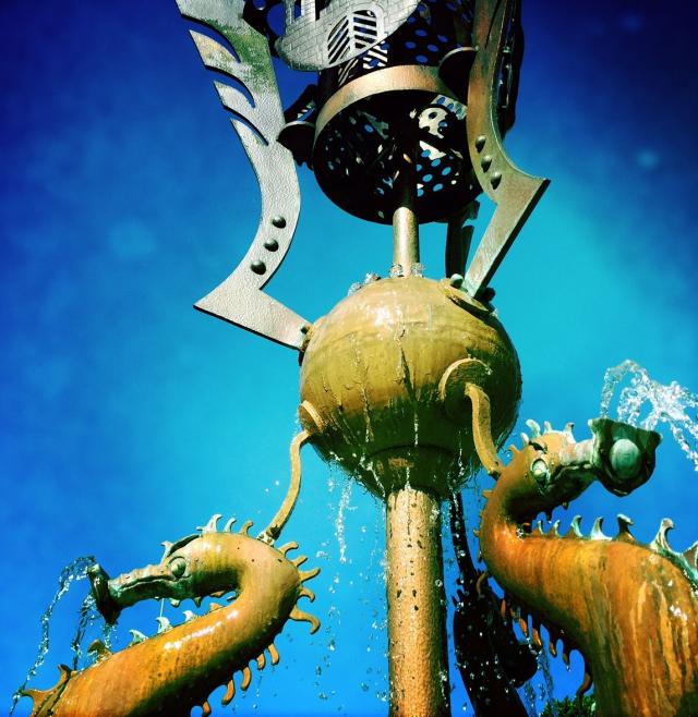 na fot.: perełka - ogromne kute z miedzi koniki wodne, zwieńczone herbem Kalisza / chyba najładniejsza i najlepiej ukryta przed kaliszanami fontanna - przy siedzibie wodociągów miejskich / kiedyś zdobiła Plac św. Józefa, mniej więcej w miejscu gdzie obecnie stoi pomnik papieża Jana Pawła II