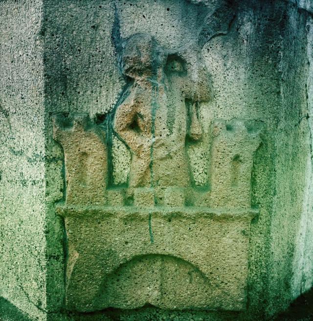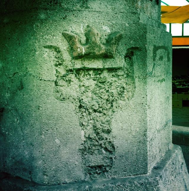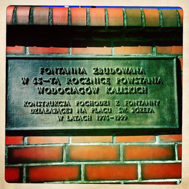 na fot.: trzon fontanny przy Nowym Rynku ze śladem po byczym pysku czyli herbie b. województwa, który pewnie opala się gdzieś w post PZPR-owskiej daczy w Szałem jako zdobyczna pamiątka końca ery i kariery w myśl zasady "Mordo ty moja!" / dziursko jak memento - symbol likwidacji województwa kaliskiego pod egidą jego ostatniego wojewody - Józefa Rogackiego, taty naszego słynnego ex-posła Adama.