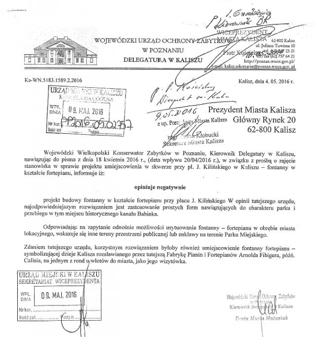 Kaliskiej konserwator zabytków nie zachwycił pomysł fontanny w kształcie fortepianu w miejsce szeroko krytykowanej, przyniszczonej i z rzadka sikającej fontanny "Nastroje" na placu Kilińskiego w Kaliszu. Z taką propozycją wystąpiła do miejskich włodarzy radna Małgorzata Zarzycka z klubu Tak dla Kalisza - zainspirowana i wspierana między innymi przez kaliskie środowiska muzyczne. Pod pismem do prezydenta, w ciągu kilku dni zebrano ponad 660 podpisów poparcia - pomysł trafił więc pod ocenę szefowej kaliskiej delegatury Wojewódzkiego Urzędu Ochrony Zabytków. Ta zaś okazała się negatywna, a konserwator zasugerowała, aby fortepian postawić na jednym z rond przy wjeździe do miasta.