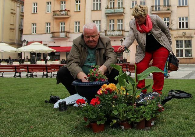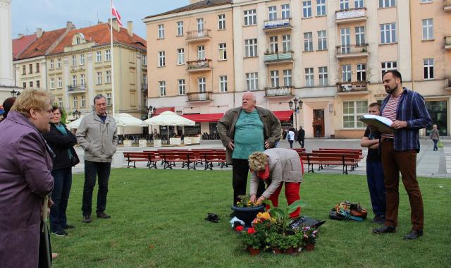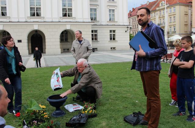 Doniczki, kwitnące sadzonki i petycja z apelem o przywrócenie klombu przed ratuszem - w środowe popołudnie kilkanaście osób zebrało się na kaliskim Rynku, aby w niecodzienny sposób zaprotestować przeciwko likwidacji kwiatów i zastąpieniu ich trawnikiem z rolki.