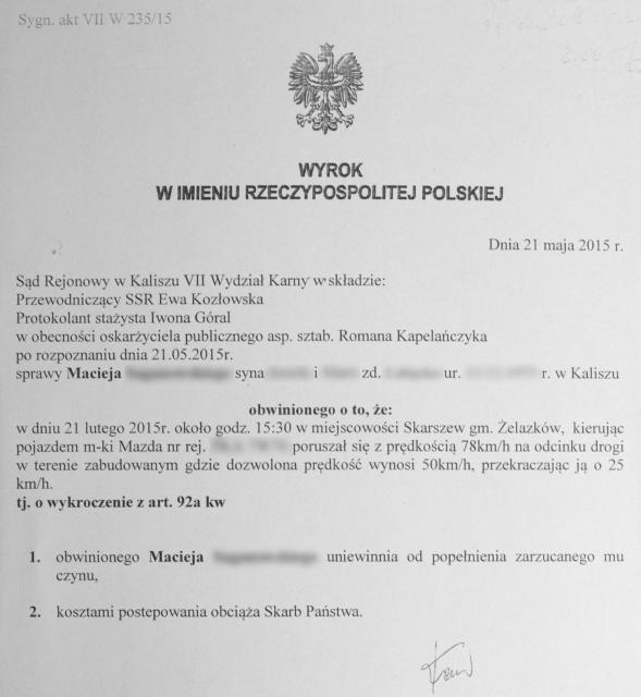 Ww. policjant - po zapoznaniu się z aktami i zeznaniami funkcjonariuszy pełniących wtedy służbę na drodze - stwierdził, że pomiar przeprowadzono bezpośrednio pod liniami energetycznymi, a tego instrukcja obsługi radaru zabrania. Pomiar taki może być niewiarygodny technicznie, a co za tym idzie również dowodowo. W tej sytuacj, policjant, co chyba bardzo mało spotykane, sam wniósł o uniewinnienie kierowcy. Sąd Rejonowy w Kaliszu do wniosku się przychylił. Nie przyniosło to policjantowi niestety uznaniu u przełożonych.