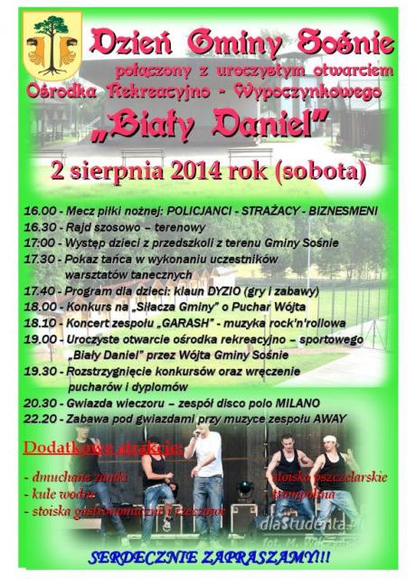 Gwiazdą wieczoru o 20:30 będzie zespół Milano. Początek Dnia Gminy Sośnie zaplanowano o godzinie 16:00, natomiast uroczyste otwarcie ośrodka "Biały Daniel" o godzinie 19:00.