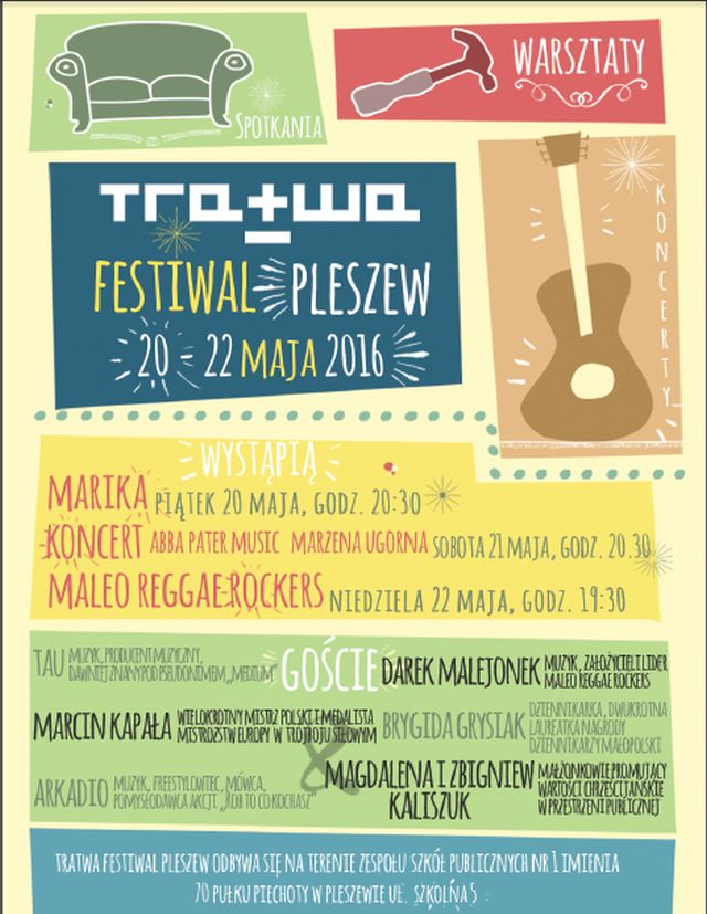 Wystąpią również Abba Pater Music & Marzena Ugorna, a na zakończenie - Maleo Reggae Rockers. Wstęp na koncerty jest wolny. Uczestnicy Festiwalu wezmą również udział w 14 ciekawych warsztatach z różnych dziedzin, m.in. nauki rysowania, treningu funkcjonalnego, warsztatach muzycznych, fotografii, tanecznych, teatralnych, kulinarnych czy warsztatach graffiti. Zapisy na zajęcia TUTAJ.