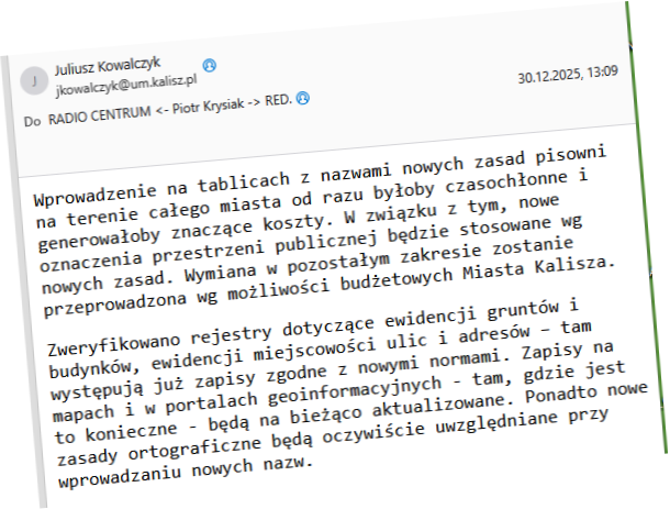 W związku z tym zwróciliśmy się z pytaniem do Urzędu Miasta Kalisza o ewentualny plan na weryfikację i korektę nieprawidłowej (od czwartku) pisowni niektórych oznaczeń na terenie miasta?