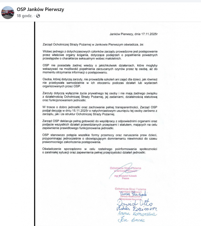 A OSP w Jankowie Pierwszym usunęła strażaka podejrzanego o pedofilię ze swoich szeregów. O tym fakcie jednostka poinformowała w oświadczeniu w mediach społecznościowych.