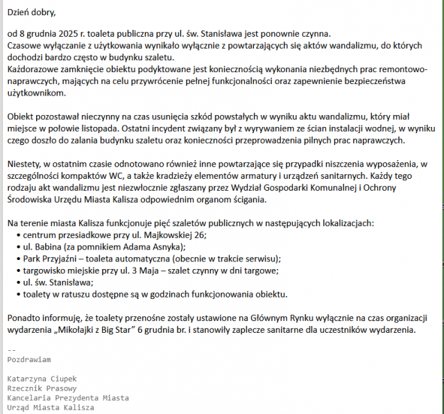 Brak czynnych toalet publicznych w tak centralnym punkcie staje się problemem nie tylko estetycznym, ale przede wszystkim sanitarnym i społecznym. W związku z tym zwracam się do Państwa z prośbą o: