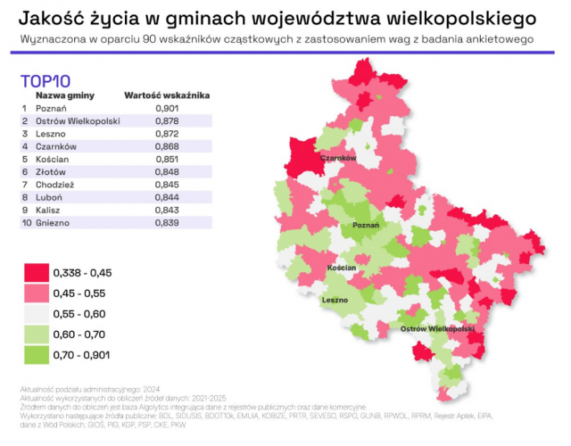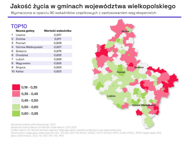 Najlepiej w regionie wypadły Leszno, Złotów i Poznań. Na drugim końcu listy znalazły się Wierzbinek, Brudzew i Dąbie — głównie z powodu słabej dostępności ochrony zdrowia i niskiej jakości infrastruktury drogowej.