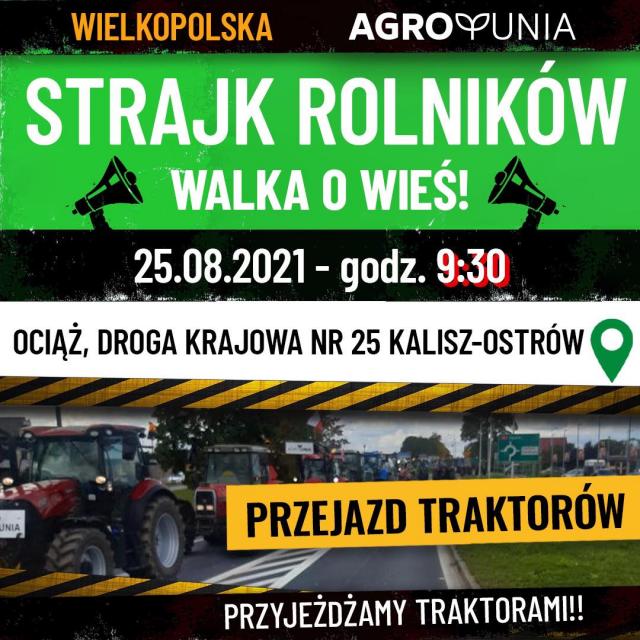 Spore utrudnienia na drodze krajowej nr 25 na odcinku od Ociąża do Ostrowa Wielkopolskiego. Trwa protest rolników. O planowanym przebiegu protestu opowiedział radiuCENTRUM Mateusz Kacperkiewicz - przedstawiciel Agrounii i koordynator protestu na powiat kaliski: "Spotykamy się o 9:30 w Ociążu, planujemy przejazd traktorów od 10:00 do 14:00. O 10:00 wyruszamy w kierunku Ostrowa Wielkopolskiego, gdzie nawracamy koło galerii. Trasę tę pokonamy dwukrotnie." Protest chcemy zakończyć o 14:00, aby był jak najmniej uciążliwy dla lokalnych mieszkańców. Dzień wcześniej, o 8:00 rano, lokalni rolnicy spotkali się w Nowym Mieście nad Wartą.