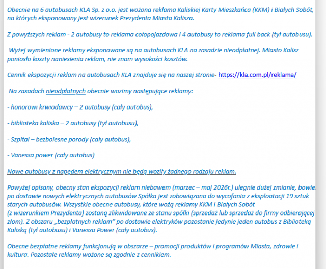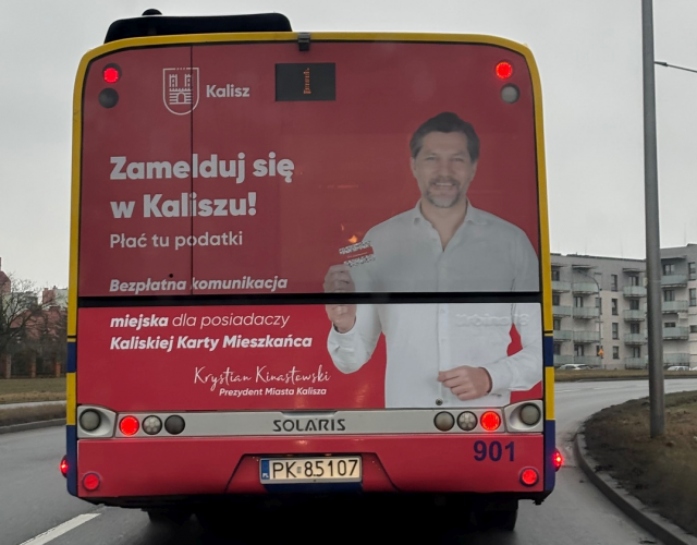 Wg anonimowych (wow!) źródeł do których dotarło radioCENTRUM_106.4, prawdopodobnie już na początku tygodnia (18. marca?) do Kalisza przyjadą pierwsze elektryczne autobusy mające zasilić tabor Kaliskich Linii Autobusowych. Jedni się cieszą, inni się martwią – wiadomo: OZE-sroze, itd., ale w wymiarze lokalnym pojawia się (albo znika, zależy jak patrzeć) jeszcze jeden problem. Jak poinformowała nas prezes Kaliskich Linii Autobusowych sp. z o.o. – Elżbieta Binder – wraz z nastaniem nowej, elektrycznej ery u przewoźnika, kończy się era gratisowego podróżowania na autobusach wizerunku obecnie urzędującego prezydenta Kalisza – Krystiana Kinastowskiego: