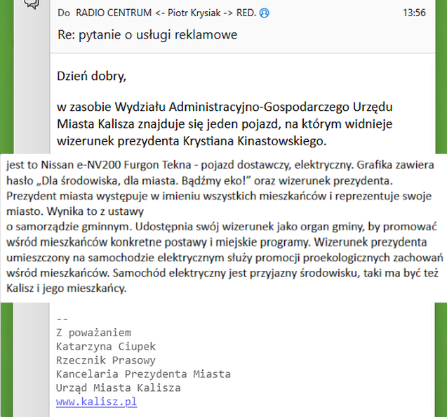 Zgodnie z rozeznaniem jakiego dokonaliśmy - w Kaliszu epatowanym dotąd podobiznami prezydenta - zostanie 1 samotne auto, na którym jego twarz reprezentuje wszystkich Kaliszan, bo zgodził się udostępnić swój wizerunek jako organ gminy i wynika to z ustawy. Tak napisała do nas rzeczniczka miasta: