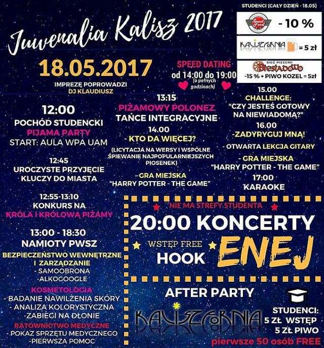 W czwartek ruszają Kaliskie Juwenalia 2017. W tym roku razem świętują studenci wszystkich kaliskich uczelni m.in. Wydziału Pedagogiczno-Artystycznego UAM w Kaliszu i Państwowej Wyższej Szkoły Zawodowej. W ramach święta żaków zaplanowano koncerty, gry miejskie i oczywiście studenckie after party. Juwenalia tradycyjnie rozpocznie o 12:00 przemarsz studentów na Główny Rynek, gdzie nastąpi oficjalne przekazanie kluczy do miasta. W tym roku mile widzianymi strojami są piżamy, bowiem będzie wybierany król i królowa nocnej mody. O godzinie 20:00 na placu Świętego Stanisława rozpoczną się koncerty. Gwiazdą tegorocznych Juwenaliów będzie zespół ENEJ.