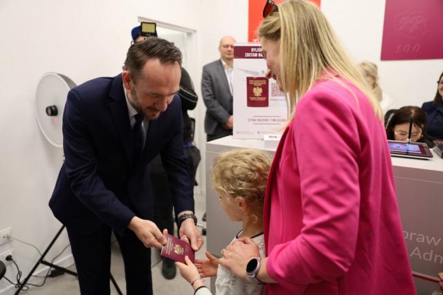 na fot.: wiceminister Tomasz Szymański wręczający pierwszy paszport tymczasowy w czasie otwarcia punktu na Ławicy