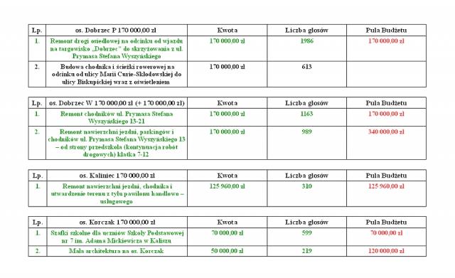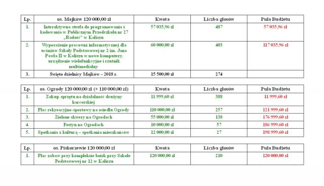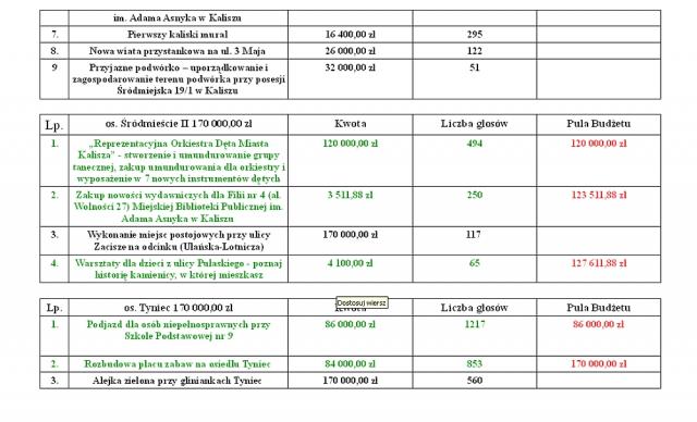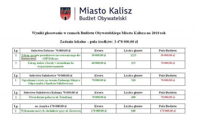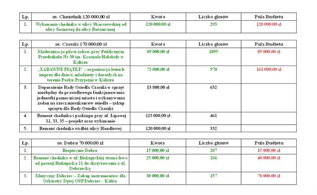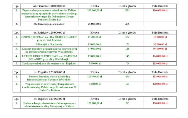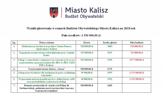 "Tegorocznym rekordzistą w budżecie obywatelskim jest zadanie: Modernizacja kuchni oraz pralni w Domu Pomocy Społecznej w Kaliszu. Jest to jedyne zadanie, na które zagłosowało ponad 3000 osób, dokładnie 3005. Kolejnymi zadaniami z największą ilością głosów to zagospodarowanie terenów wokół glinianki na Tyńcu, zakup dwóch samochodów rozpoznawczo-ratowniczych dla PSP w Kaliszu, czy zakup nowych boksów dla bezdomnych psów w kaliskim schronisku".