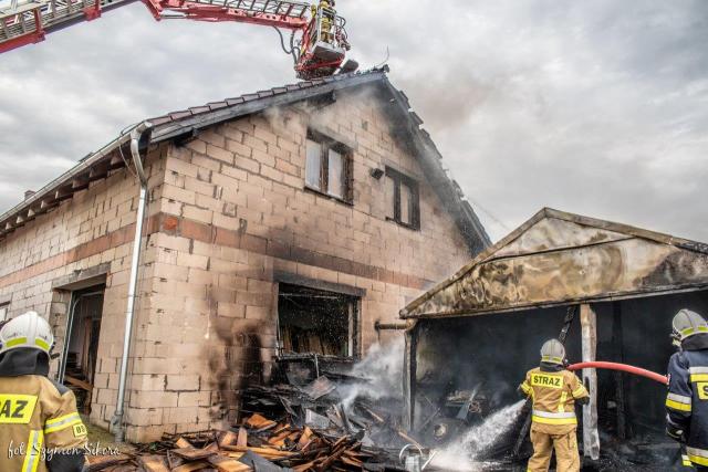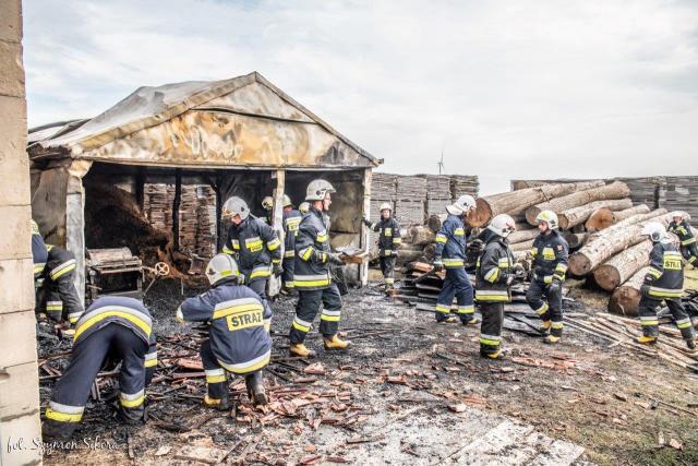 Ogień objął wiatę, w której składowane były deski i trociny, płomienie błyskawicznie rozprzestrzeniły się na dach przylegającego do wiaty zakładu stolarskiego.