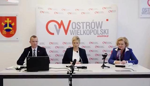 na fot.: O wynikach audytu poinformowano podczas konferencji online; od lewej: Mikołaj Kostka / zastępca prezydenta Ostrowa, Beata Klimek / prezydent Ostrowa, Marzena Wodzińska / prezes RZZO; fot. Screen z transmisji konferencji