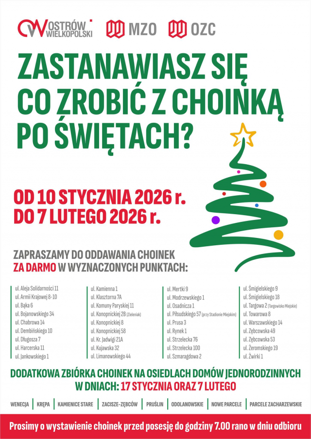 Z kolei mieszkańcy domów jednorodzinnych mogą po prostu, w jednym z dwóch wyznaczonych terminów – czyli 17 stycznia lub 7 lutego - wystawić drzewko przed dom. W obu przypadkach choinki zostaną bezpłatnie odebrane przez miejskie służby komunalne i wykorzystane do produkcji czystszej energii, dla ostrowskiej sieci cieplnej.