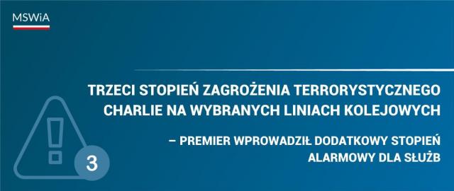 Stopnie alarmowe to cztery poziomy zagrożenia terrorystycznego w Polsce, które służą do zwiększenia gotowości służb i administracji do reagowania na możliwe zagrożenia oraz informują obywateli o konieczności zachowania szczególnej czujności. CHARLIE to trzeci stopień zagrożenia terrorystycznego.