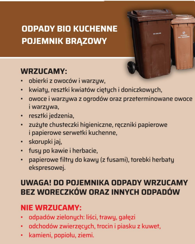 Do niedawna resztki jedzenia przetworzonego trafiały do kontenera na odpady zmieszane. Teraz do pojemnika bio mogą trafiać resztki mięsa i ryb, niedokończone obiady, kości, czerstwe pieczywo, a także obierki z owoców i warzyw, przeterminowane owoce i warzywa, kwiaty oraz resztki kwiatów ciętych i doniczkowych, po otrzepaniu ziemi, która trafia do zmieszanych. . Do bio-odpadów zaliczają się również zużyte chusteczki higieniczne, ręczniki papierowe i papierowe serwetki kuchenne, skorupki jaj, fusy po kawie i herbacie, papierowe filtry do kawy wraz z fusami oraz torebki herbaty ekspresowej. Należy pamiętać, że do pojemnika na odpady bio-kuchenne nie wolno wrzucać odpadów zielonych, takich jak liście, trawa czy gałęzie, a także odchodów zwierzęcych, trocin, piasku z kuwet, kamieni, popiołu i ziemi.