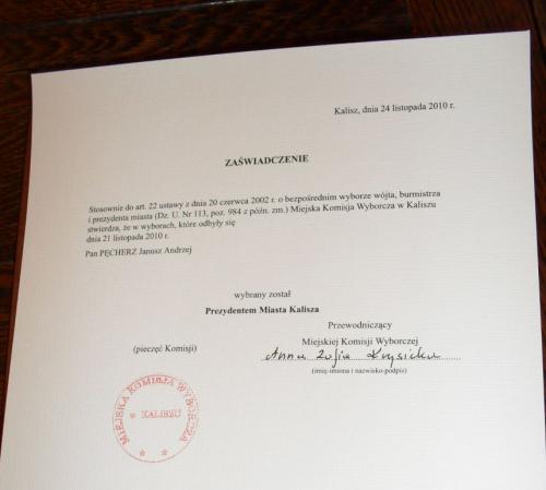 "... Miejska Komisja Wyborcza w Kaliszu, stwierdza, że w wyborach, które odbyły się 21 listopada 2010 roku Pan Janusz Andrzej Pęcherz wybrany został Prezydentem Miasta Kalisza."