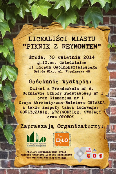 Licealiści miastu, czyli Piknik z Reymontem. Pierwszą taką w Ostrowie imprezę przygotowuje 2 LO. Zwykle szkoła obchodziła święto swojego patrona jesienią podczas tradycyjnych akademii. jednak z tym roku wraz z 90. rocznicą przyznania Reymontowi Nagrody Nobla szkoła wychodzi do mieszkańców i zaprasza do wspólnego świętowania .