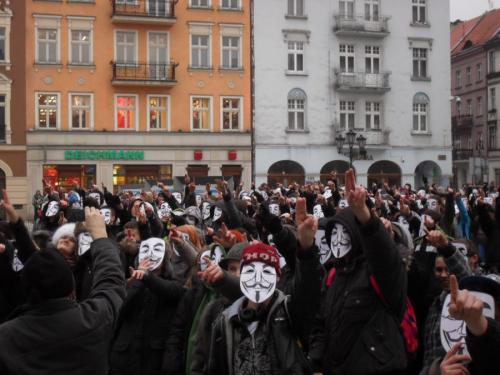 To był jeden z najkrótszych i jednocześnie najliczniejszych, choć bezowocnych, protestów przed kaliskim ratuszem. W środę, dokładnie o godzinie 15-tej rozpoczął się dość oryginalny protest typu Flash Mob*. Według organizatorów ponad tysiąc kaliszan (głównie uczniów), wg obserwatorów znacznie mniej, protestowało przeciwko podpisaniu przez rząd porozumienia ACTA. Uczestnicy akcji przez dwie minuty z maskami na twarzach wskazywali palcami na ratusz. A więcej o całym symbolicznym proteście opowiedzieli Radiu Centrum jego uczestnicy:
