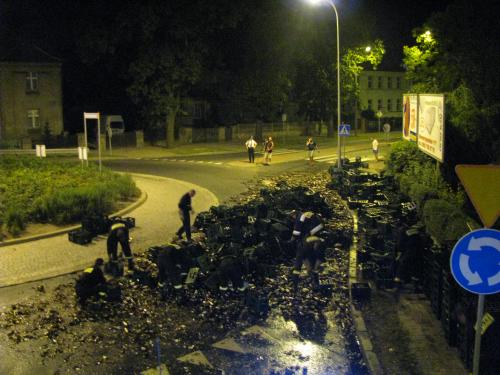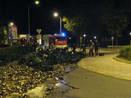 Najprawdopodobniej ładunek był źle zabezpieczony i w czasie jazdy wypadł z naczepy na ulicę. Strażacy usuwali rozbite butelki przez blisko 2,5 godziny. Rondo w tym czasie było częściowo zablokowane. Za tę sytuację kierowcę ukarano mandatem karnym.
