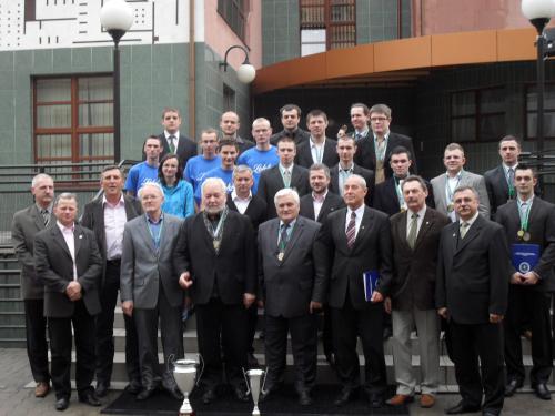 Wypadałoby podpisać zdjęcie: Puchar Grzegorzowi Cieślakowi wręcza prof. Jan Cholajda, z tyłu po prawej stoi prof. dr hab. Stefan Kowal, po lewej siedzi prezes KPR Szczypiorno Tomasz Kwinta.