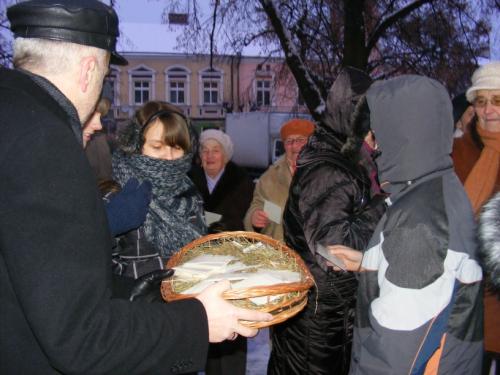 Kilkadziesiąt osób przybyło w niedzielę na rynek w Stawiszynie, w powiecie kaliskim, aby uczestniczyć we wspólnej wieczerzy wigilijnej. Spotkanie zorganizowano po raz dziewiąty. Mieszkańcy tradycyjnie już - wspólnie z władzami miasta - podzielili się opłatkiem i złożyli sobie świąteczne życzenia.
