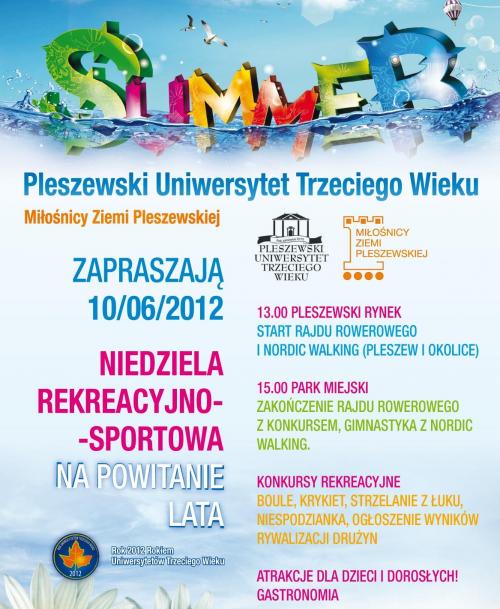 Pomysł wpisuje się w Europejski Rok Aktywności Osób Starszych i Solidarności Międzypokoleniowej. A PUTW go podchwycił i wespół z miastem organizuje imprezę rekreacyjną. Rozpocznie się o godz. 13:00 przed ratuszem, skąd wyruszy kilkudziesięciu rowerzystów na 15 - kilometrowy rajd wokół Pleszewa. Poprowadzi go Krystyna Jagiołka. Na trasie konkursy, zabawy. Od 15:00 w parku ciąg dalszy. Do imprezowania przyłączą się pleszewscy harcerze oraz bracia kurkowi.