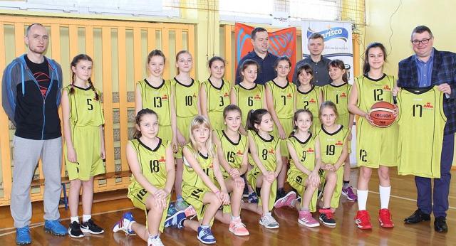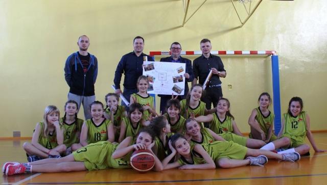 na fot. Artur Nowakowski / dyrektor generalny ZMK-Delikates Sp. z o.o. z Ostrowa odbiera podziękowania od koszykarek Szkoły Podstawowej nr 1 w Ostrowie