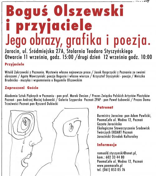 Ekspozycję uświetnią również wspomnienia o artyście. Oprócz grafik i prac malarskich, w piątek zaprezentowane będą też wiersze autorstwa Bogumiła Olszewskiego i jego przyjaciół. Otwracie wystawy zaplanowano w piątek, o godz. 15:00 i czynna będzie do 20:00. Ekspozycja będzie dostępna dla publiczności rownież w sobotę, od godziny 10:00 do 14:00. Wstęp wolny.